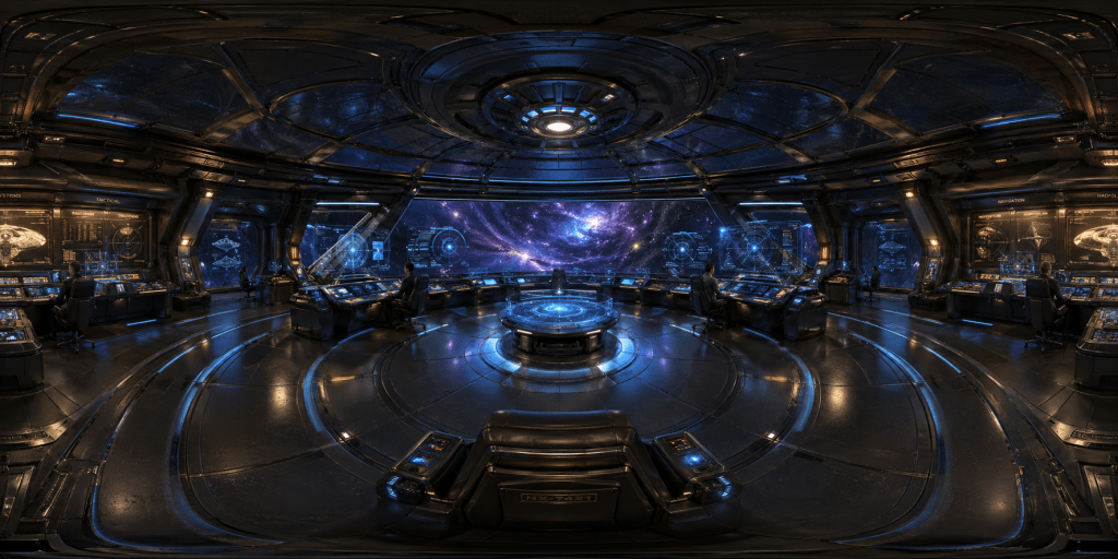 I asked for the bridge of a futuristic starship. The Expanse meets Star Trek. Holographic displays floating in mid-air, a massive curved viewport showing a purple nebula, crew stations lining the periphery, and a captain’s chair behind you. The geek in me was quietly delighted.